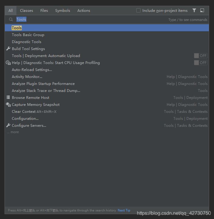 可能有的小伙伴工具欄沒(méi)有Tools這一個(gè)選項(xiàng),通常是破解后的軟件沒(méi)有這一選項(xiàng),可以雙擊Shift鍵,輸入Tools進(jìn)行搜索可以找到:
