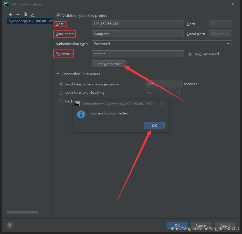 然后點(diǎn)擊Test Connection,出現(xiàn)Successful connected!表示與服務(wù)器建立了連接,若連接失敗,請(qǐng)檢查服務(wù)器是否開(kāi)啟了SSH;然后點(diǎn)擊Apply應(yīng)用該配置。