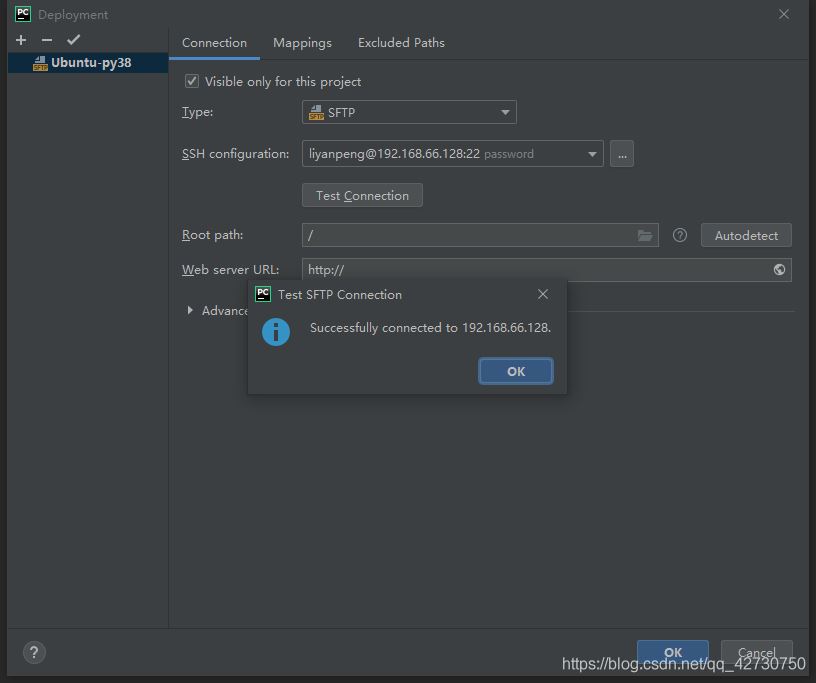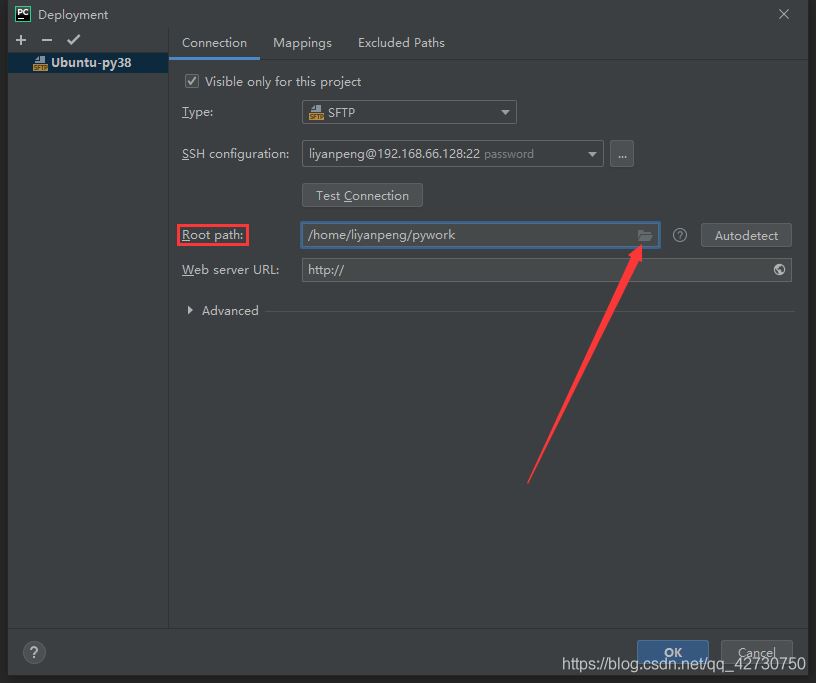 接著就配置在Pycharm顯示的服務(wù)器的根目錄,這里將Root path配置為/home/liyanpeng/pywork,這里不建議填寫(xiě)根目錄或其他目錄,否則Pycharm會(huì)顯示服務(wù)器上的該目錄下的所有文件夾及其文件。