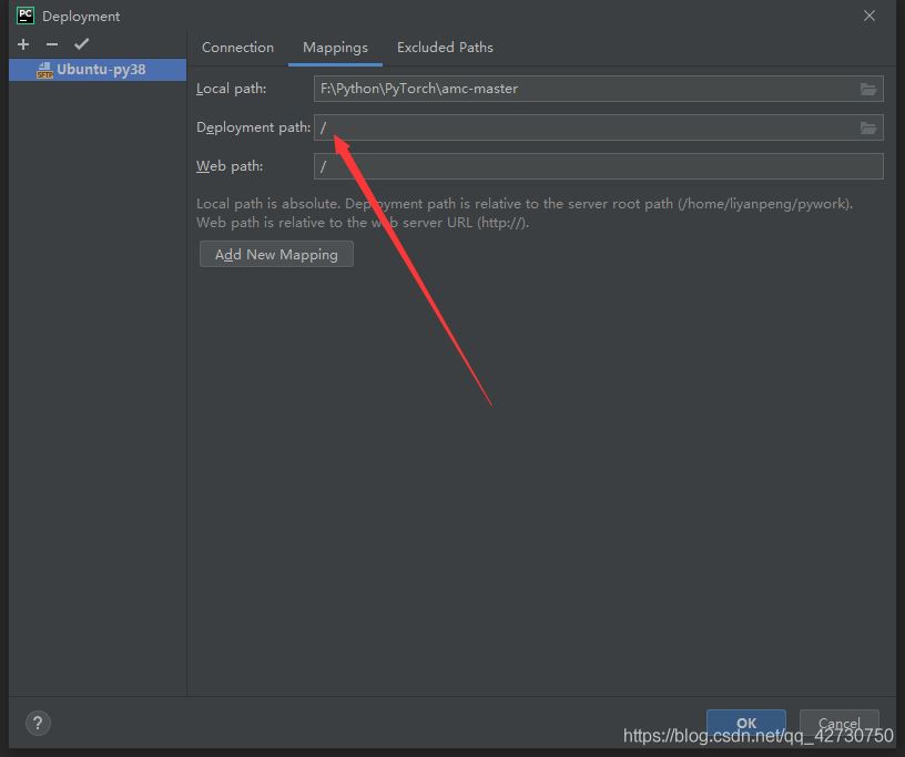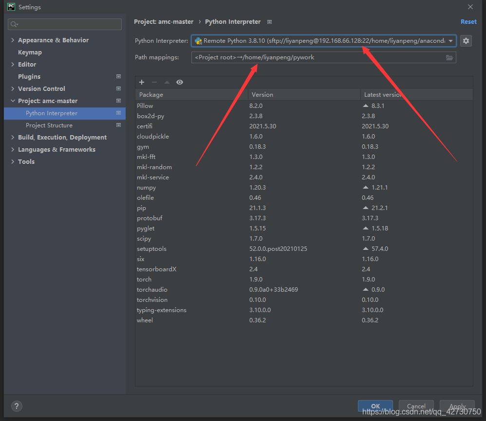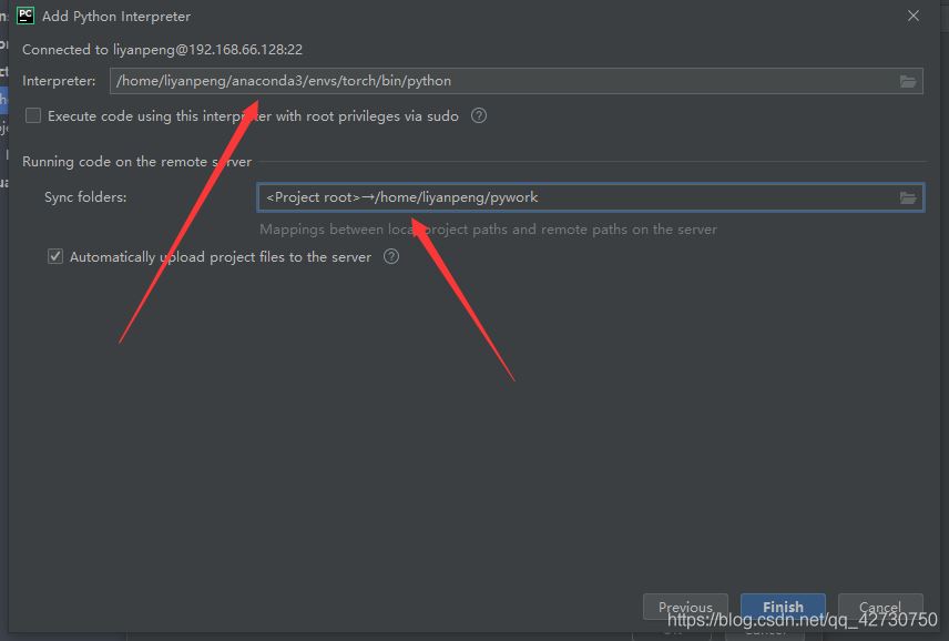 然后就會(huì)看到遠(yuǎn)程的Python解析器所在的目錄以及項(xiàng)目代碼默認(rèn)的路徑,第一個(gè)可以不改,但最好改成在服務(wù)器上安裝好的anaconda的環(huán)境,方便管理,我的anaconda環(huán)境為/home/liyanpeng/anaconda3/envs/torch/bin/python;下面的代碼同步的文件路徑換成我們?cè)谂渲仆酱a文件時(shí)的那個(gè)路徑/home/liyanpeng/pywork: