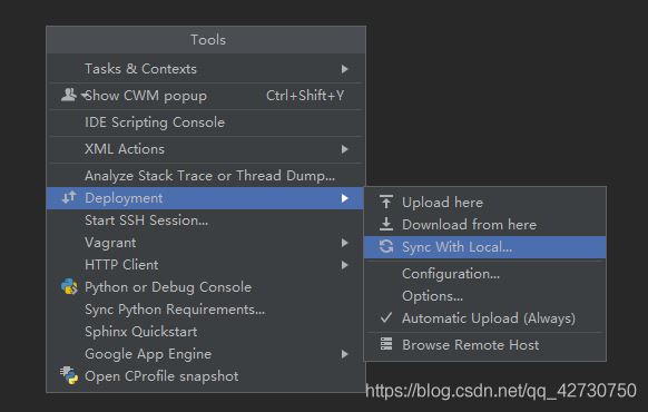 接著依次點(diǎn)擊Tools − − > --> −−> Deployment − − > --> −−> Sync With Local來(lái)將本地代碼同步到服務(wù)器上: