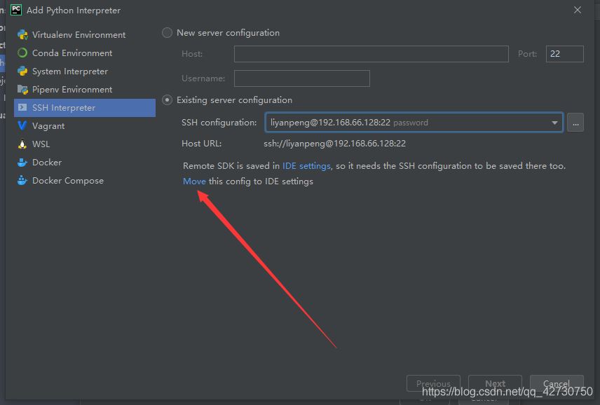 按照?qǐng)D示選擇剛剛創(chuàng)建的web server,下面有一行字Remote SDK is saved in IDE settings,so it needs the SSH configuration to be saved there too.,意思是說(shuō),遠(yuǎn)程的SDK保存在了IDE settings中,所以SSH的配置信息也要保存在那里,點(diǎn)擊Move將配置信息移動(dòng)到IDE settings中,然后點(diǎn)擊Next。