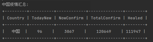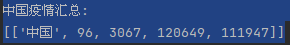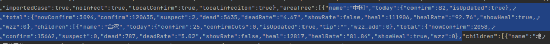 def get_all_china(content): tmp_data = content["data"] area_data = json.loads(tmp_data)["areaTree"] country = area_data[0] country_list = [] name = country["name"] today_confirm = country["today"]["confirm"] now_confirm = country["total"]["nowConfirm"] total_confirm = country["total"]["confirm"] total_heal = country["total"]["heal"] country_list.append([name, today_confirm, now_confirm, total_confirm, total_heal]) return country_list