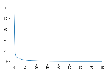 如果將s用圖像來表示,我們可以看到大部分的奇異值都集中在前的部分: