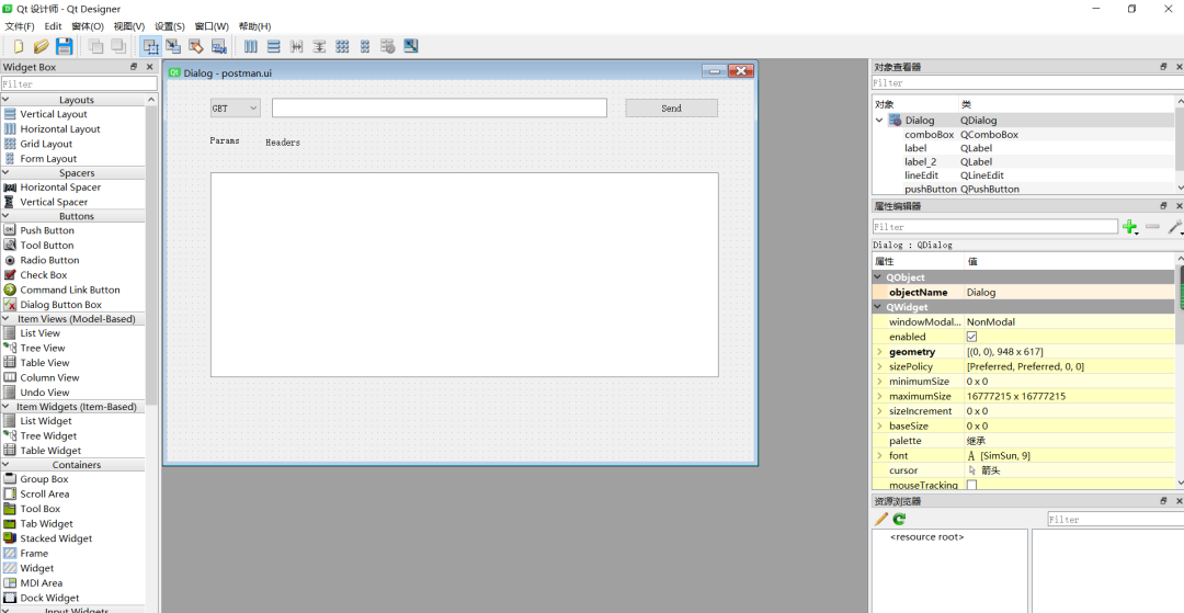 <?xml version="1.0" encoding="UTF-8"?> <ui version="4.0"> <class>Dialog</class> <widget class="QDialog" name="Dialog"> <property name="geometry"> <rect> <x>0</x> <y>0</y> <width>948</width> <height>617</height> </rect> </property> <property name="windowTitle"> <string>Dialog</string> </property> <widget class="QComboBox" name="comboBox"> <property name="geometry"> <rect> <x>70</x> <y>30</y> <width>81</width> <height>31</height> </rect> </property> <item> <property name="text"> <string>GET</string> </property> </item> <item> <property name="text"> <string>POST</string> </property> </item> </widget> <widget class="QLineEdit" name="lineEdit"> <property name="geometry"> <rect> <x>170</x> <y>30</y> <width>541</width> <height>31</height> </rect> </property> </widget> <widget class="QPushButton" name="pushButton"> <property name="geometry"> <rect> <x>740</x> <y>30</y> <width>151</width> <height>31</height> </rect> </property> <property name="text"> <string>Send</string> </property> </widget> <widget class="QLabel" name="label"> <property name="geometry"> <rect> <x>70</x> <y>90</y> <width>72</width> <height>15</height> </rect> </property> <property name="text"> <string>Params</string> </property> </widget> <widget class="QLabel" name="label_2"> <property name="geometry"> <rect> <x>160</x> <y>90</y> <width>121</width> <height>21</height> </rect> </property> <property name="text"> <string>Headers</string> </property> </widget> <widget class="QTextEdit" name="textEdit"> <property name="geometry"> <rect> <x>70</x> <y>150</y> <width>821</width> <height>331</height> </rect> </property> </widget> </widget> <resources/> <connections/> </ui>