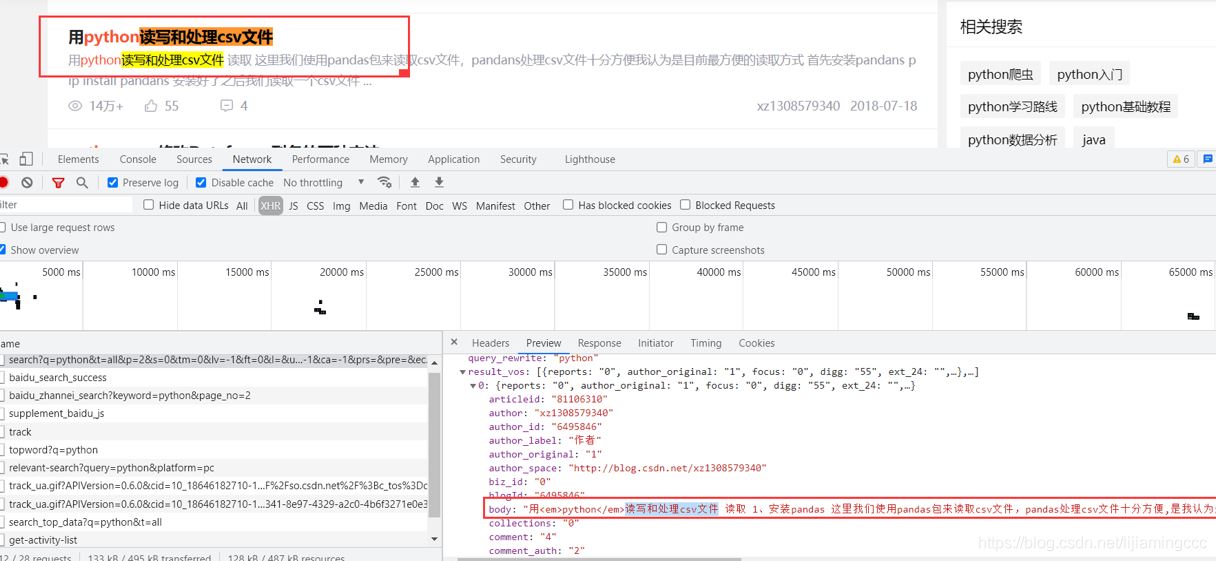 經(jīng)過測試發(fā)現(xiàn),CSDN搜索引擎的主要功能是,搜索所有跟python有關(guān)的文章,然后根據(jù)文章熱度,點(diǎn)贊量,留言數(shù)進(jìn)行一個(gè)綜合排序,展示給用戶排序后的文章結(jié)果。這樣來說,我們的主要任務(wù)就是利用抓包抓取到前后端傳輸數(shù)據(jù)的接口,通過接口,來實(shí)現(xiàn)整個(gè)搜索引擎的效果。