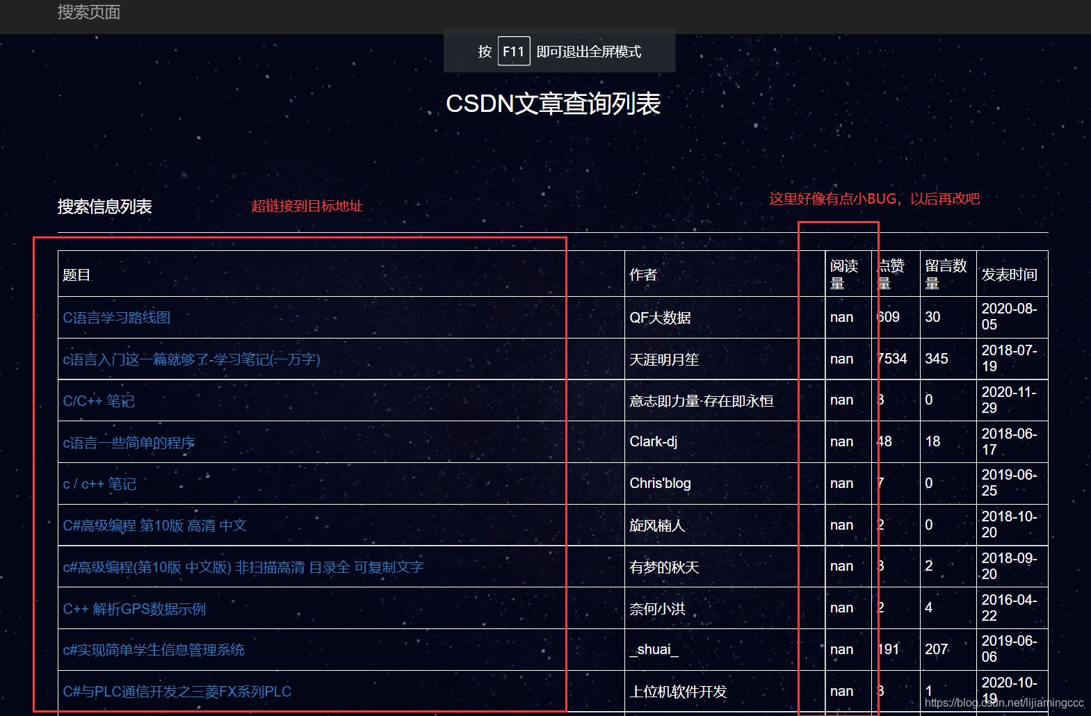 測試CSDN搜索引擎的功能,嘗試輸入?yún)?shù)之后,查看返回的文章信息列表,測試如下: