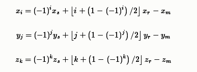 鏡像聲源$(i,j,k)$到麥克風距離在三個坐標軸上的位置為