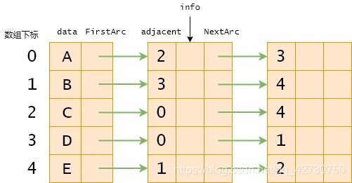 第二部分為用一個(gè)結(jié)點(diǎn)來存儲(chǔ)圖中的每一條邊或弧,該結(jié)點(diǎn)由adjacent域、info域和NextArc域組成,這些結(jié)點(diǎn)形成了單鏈表。這部分結(jié)點(diǎn)可以這樣定義: