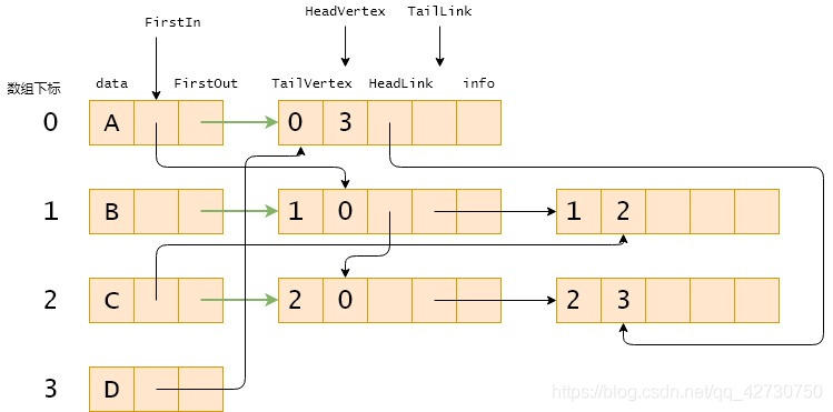 頂點(diǎn)結(jié)點(diǎn)包含data域、FirstIn域和FirstOut域,其中data域存儲(chǔ)頂點(diǎn)的值,FirstIn域指向以當(dāng)前頂點(diǎn)為弧頭的第