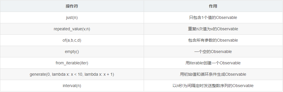首先是創(chuàng)建Observable的操作符,列舉了一些比較常用的創(chuàng)建型操作符。