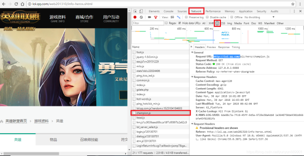2.從上面網(wǎng)址可以看到所有英雄都在,按下F12查看源代碼,發(fā)現(xiàn)英雄及皮膚圖片并沒有直接給出,而是隱藏在JS文件中。這時候需要點開Network,找到js窗口,刷新網(wǎng)頁,就看到一個champion.js的選項,點擊可以看到一個字典——里面就包含了所有英雄的名字(英文)以及對應的編號。