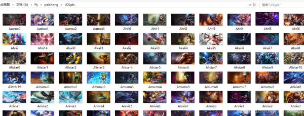 if __name__ == '__main__': url_js = r'http://lol.qq.com/biz/hero/champion.js' path = r'./data/'#圖片存在的文件夾 dict_js = path_js(url_js) url_list = path_url(dict_js) list_filePath = name_pic(dict_js, path) writing(url_list, list_filePath)