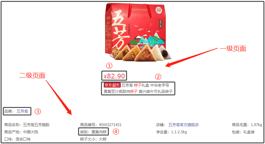 - 爬取說明:基于京東網(wǎng)站,我們搜索網(wǎng)站“粽子”數(shù)據(jù),大概有100頁(yè)。我們爬取的字段,既有一級(jí)頁(yè)面的相關(guān)信息,還有二級(jí)頁(yè)面的部分信息;