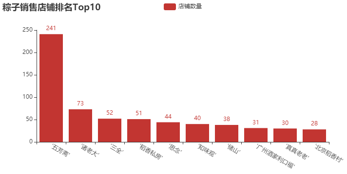 結(jié)論分析:在我印象中,小時(shí)候一直吃的最多的就是“甜粽子”,直到我上了初中才知道,粽子還可以有肉?當(dāng)然,從圖中可以看出,賣“鮮肉粽”的店鋪還是居多,畢竟這個(gè)送人,還是顯得高端、大氣一些。這里還有一些口味,像“蜜棗粽”、“豆沙粽”,我基本沒吃過。如果你送人,你會(huì)送什么口味的呢?