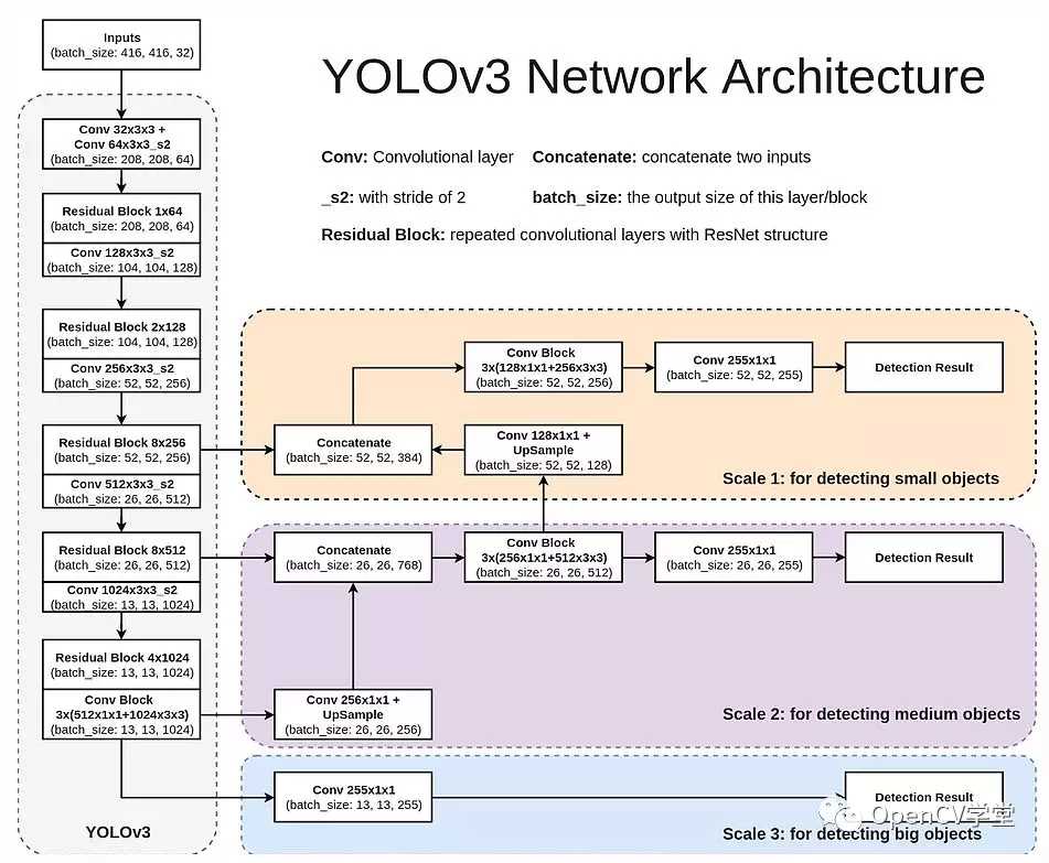 可以看出,他是一系列卷積、殘差、上采樣組成的。特點在于,它將預(yù)測分在三個尺度(Scale)進(jìn)行(見圖中三個彩色框),也在三個scale分別輸出。