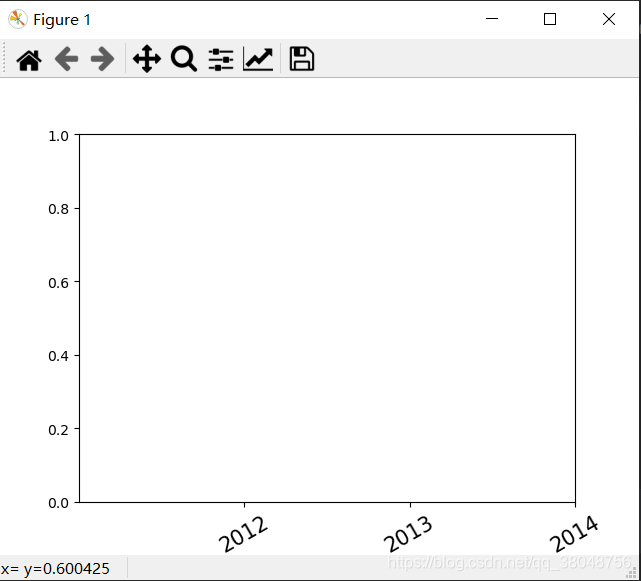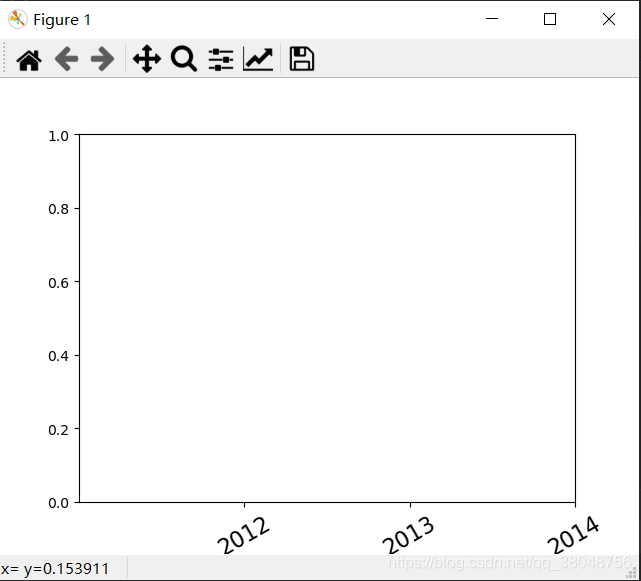 import matplotlib.pyplot as plt fig, ax = plt.subplots() ticks = [1, 2, 3] # 指定坐標軸上顯示的刻度(坐標軸默認的刻度為[0, 0.2, 0.4, 0.6, 0.8, 1.0]) labels = [2012, 2013, 2014] # 準備上面指定的坐標軸的刻度對應替換的標簽列表 ax.set_xticks(ticks) ax.set_xticklabels(labels, rotation=30, fontsize=16) plt.show()