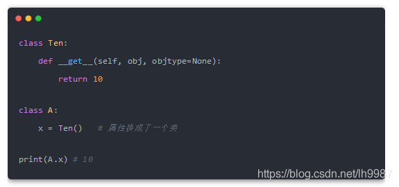 仔細(xì)看,這次類(lèi)屬性x不再是一個(gè)具體的值,而是一個(gè)類(lèi)Ten。Ten中定義了一個(gè)__get__方法,返回具體的值。