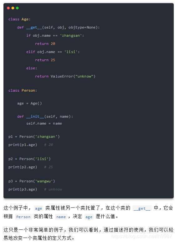 在這例子中,類(lèi)屬性age是一個(gè)描述符,它的值取決于Age類(lèi)。