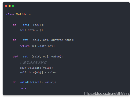 首先我們定義一個(gè)校驗(yàn)基類(lèi)Validator,在__set__方法中先調(diào)用validate方法校驗(yàn)屬性是否符合要求,然后再對(duì)屬性進(jìn)行賦值。