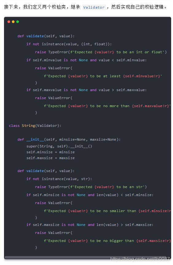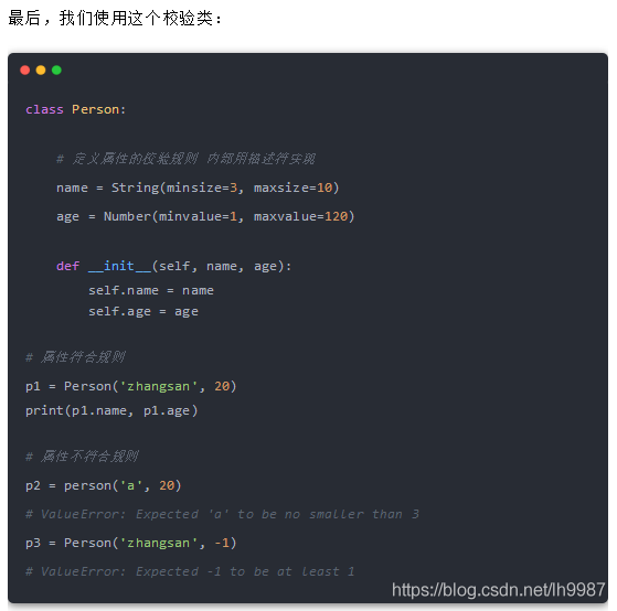 在這里我用描述符實(shí)現(xiàn)了一個(gè)屬性校驗(yàn)器,你可以參考這個(gè)例子,在類(lèi)似的場(chǎng)景中去使用它。