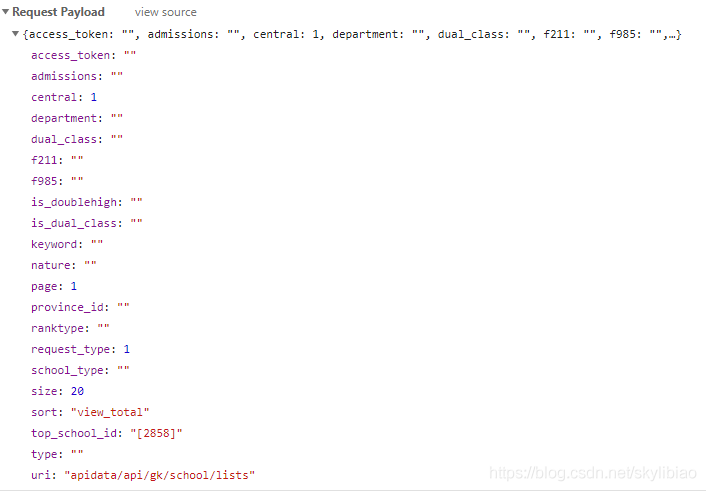 刷新頁面,觀察url,通過對Reponse的分析找到真正的url為:https://api.eol.cn/gkcx/api/