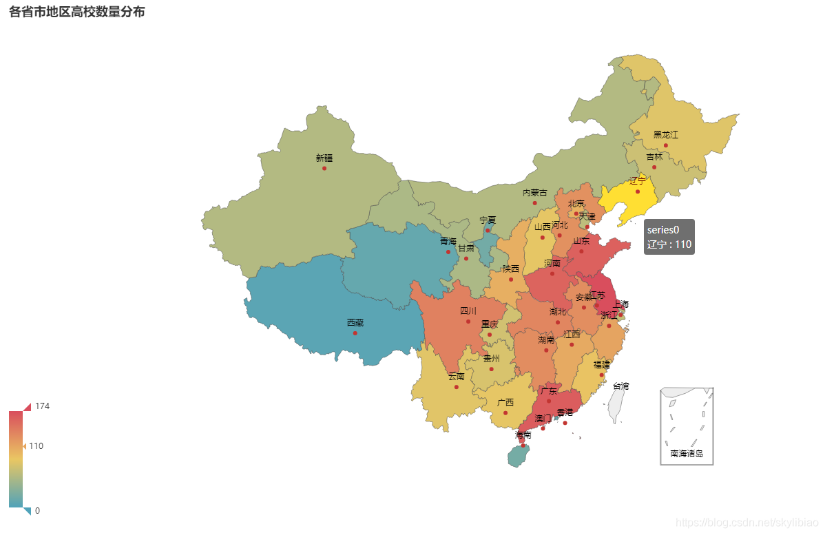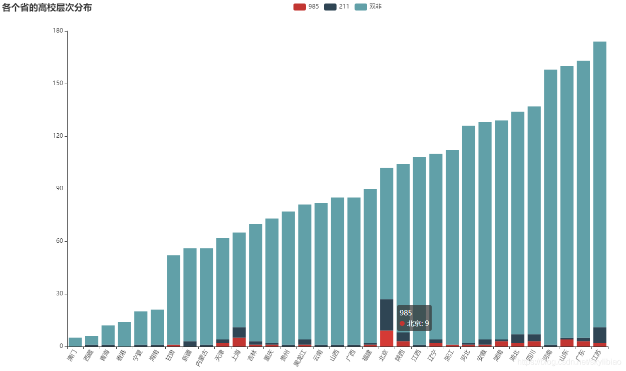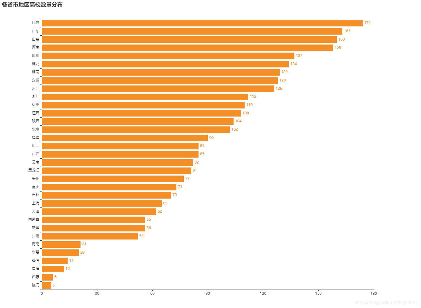 1.各省市地區(qū)高校數(shù)量分布 柱形圖: