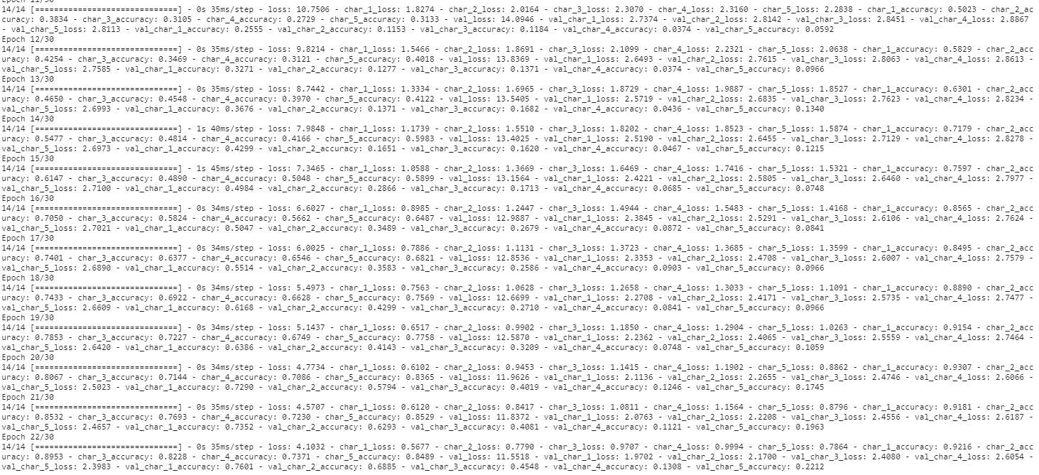 11/11 [==============================] - 0s 11ms/step - loss: 0.7246 - char_1_loss: 0.0682 - char_2_loss: 0.1066 - char_3_loss: 0.2730 - char_4_loss: 0.2636 - char_5_loss: 0.0132 - char_1_accuracy: 0.9844 - char_2_accuracy: 0.9657 - char_3_accuracy: 0.9408 - char_4_accuracy: 0.9626 - char_5_accuracy: 0.9938