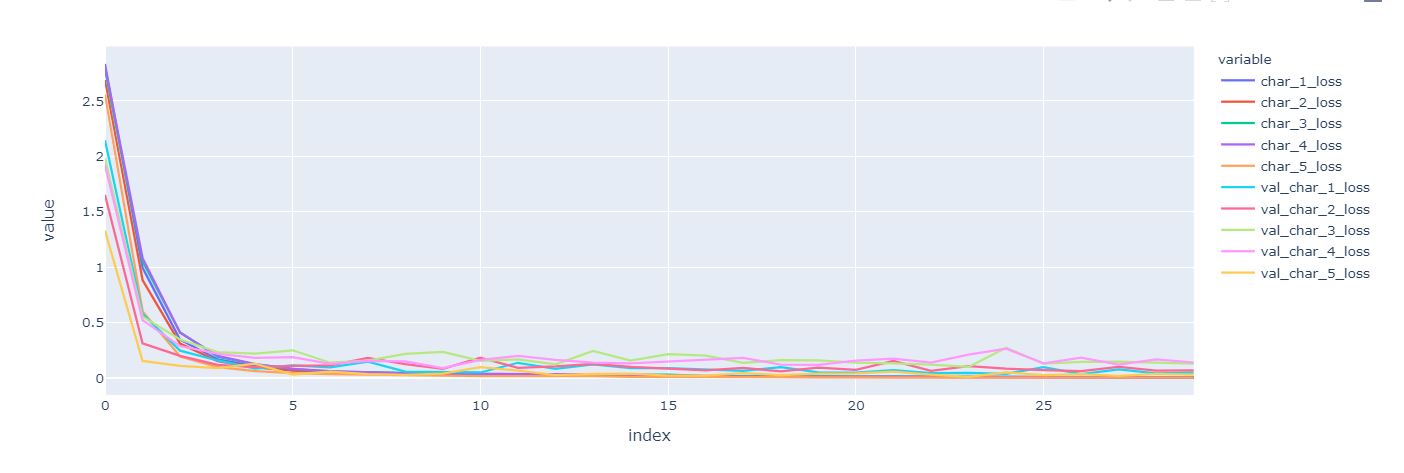 metrics = ['loss','char_1_loss', 'char_2_loss', 'char_3_loss', 'char_4_loss', 'char_5_loss', 'char_1_acc', 'char_2_acc', 'char_3_acc', 'char_4_acc', 'char_5_acc']