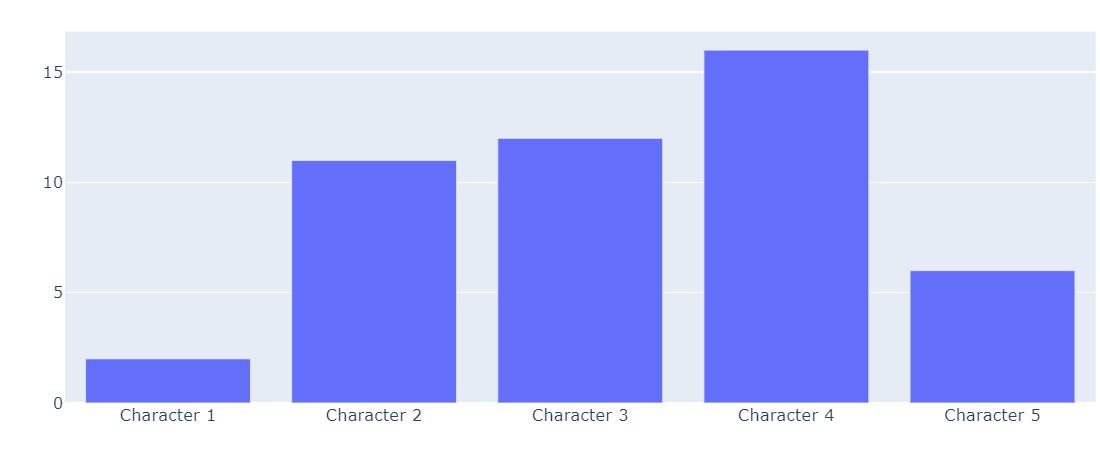 x1 = ["Character " + str(x) for x in range(1, 6)] fig = go.Figure(data=[go.Bar(x = x1, y = list(letterDiff.values()))]) fig.show()