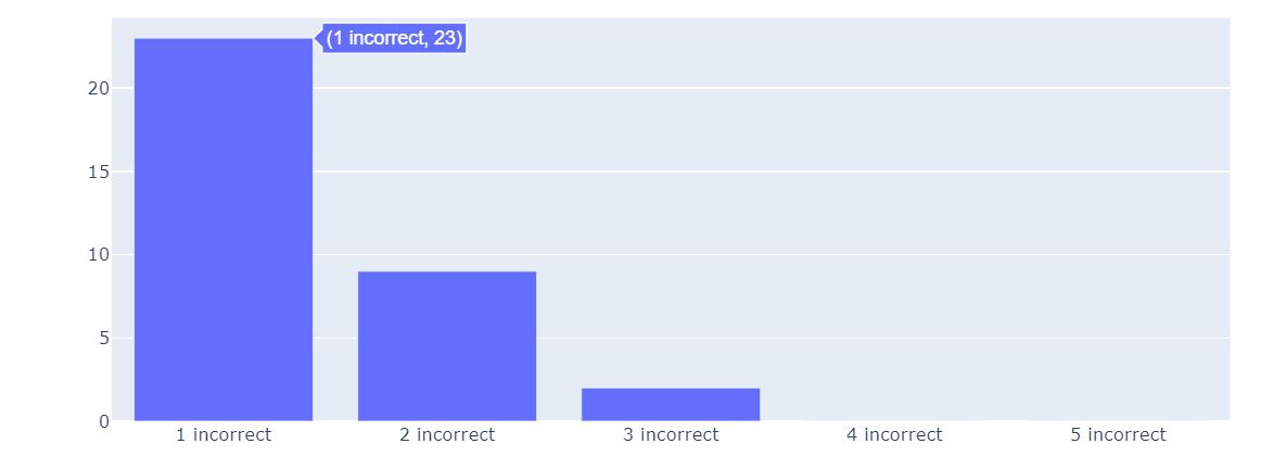 x2 = [str(x) + " incorrect" for x in incorrectness.keys()] y2 = list(incorrectness.values()) fig = go.Figure(data=[go.Bar(x = x2, y = y2)]) fig.show()