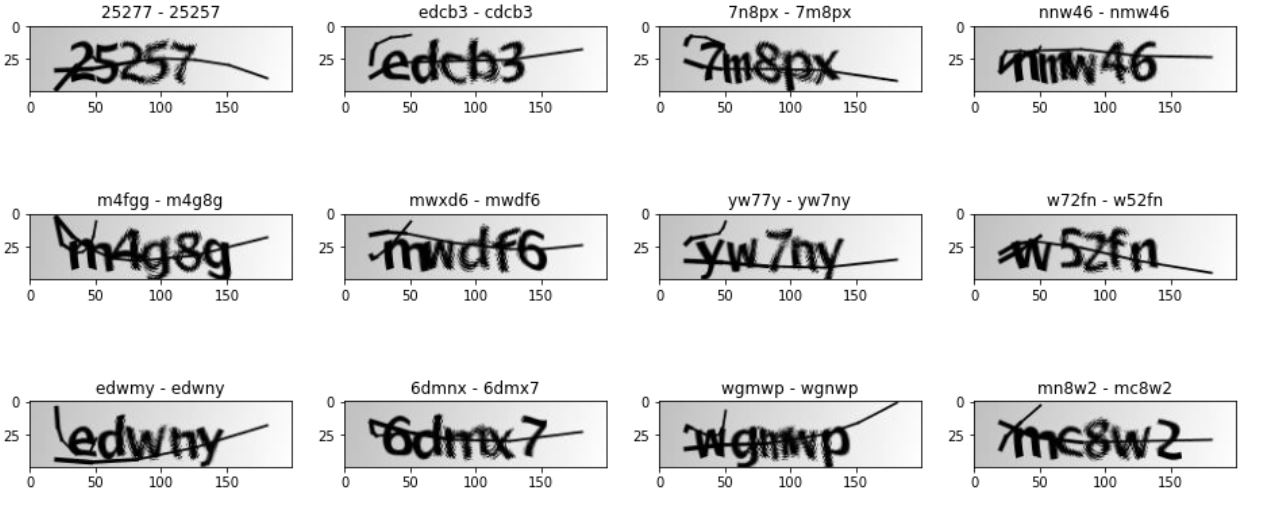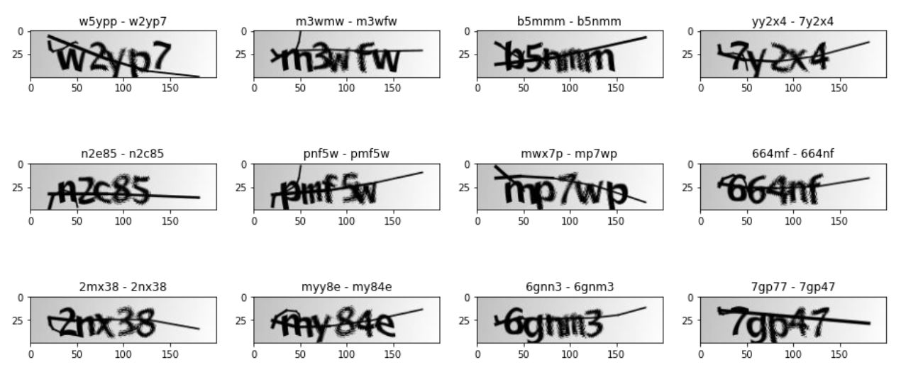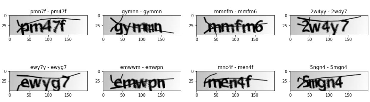 圖片是5個字母的單詞,可以包含數(shù)字。這些圖像應(yīng)用了噪聲(模糊和一條線)。它們是200 x 50 PNG。我們的任務(wù)是嘗試制作光學(xué)字符識別算法的模型。