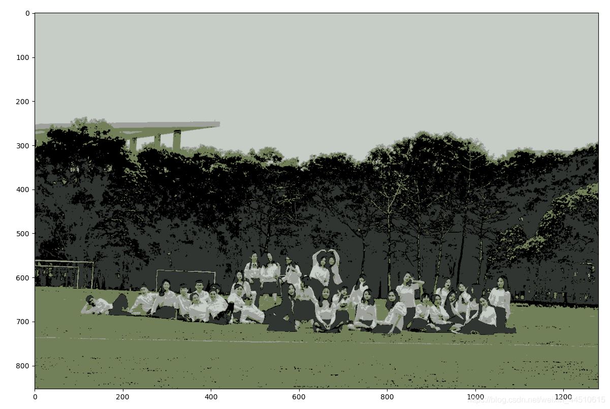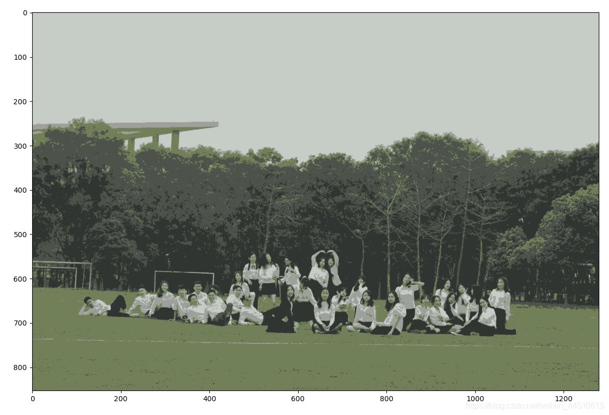 上面圖像,會發(fā)現(xiàn)五種主要顏色(分別是天空、草地、樹、人的上身白,人的下身黑)