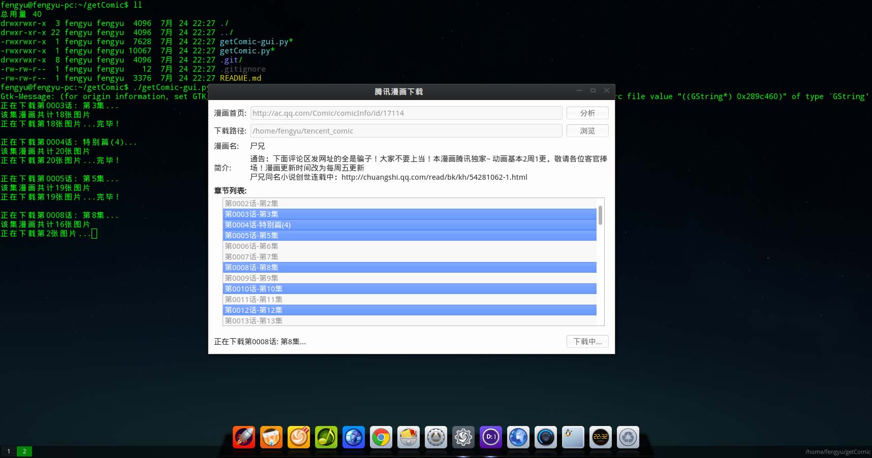 usage: getComic.py [-h] [-u URL] [-p PATH] [-d] [-l LIST] *下載騰訊漫畫,僅供學(xué)習(xí)交流,請勿用于非法用途* 空參運(yùn)行進(jìn)入交互式模式運(yùn)行。 optional arguments: -h, --helpshow this help message and exit -u URL, --url URL 要下載的漫畫的首頁,可以下載以下類型的url: http://ac.qq.com/Comic/comicInfo/id/511915http://m.ac.qq.com/Comic/comicInfo/id/505430http://pad.ac.qq.com/Comic/comicInfo/id/505430http://ac.qq.com/naruto -p PATH, --path PATH 漫畫下載路徑。 默認(rèn): /home/fengyu/tencent_comic -d, --dir 將所有圖片下載到一個目錄(適合騰訊漫畫等軟件連看使用) -l LIST, --list LIST 要下載的漫畫章節(jié)列表,不指定則下載所有章節(jié)。格式范例: N - 下載具體某一章節(jié),如-l 1, 下載第1章N,N... - 下載某幾個不連續(xù)的章節(jié),如 "-l 1,3,5", 下載1,3,5章N-N... - 下載某一段連續(xù)的章節(jié),如 "-l 10-50", 下載[10,50]章雜合型 - 結(jié)合上面所有的規(guī)則,如 "-l 1,3,5-7,11-111"