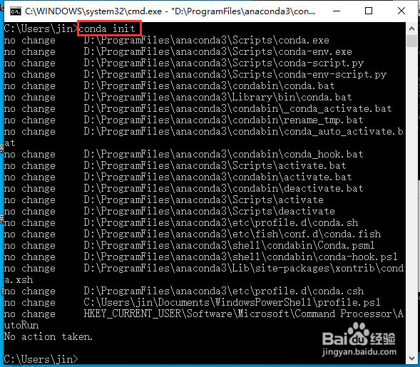 第一,Windows10系統(tǒng)下,按Win+R鍵啟動運行,輸入cmd,進入命令窗口,輸入conda init,對conda 進行初始化,如果之前做過這步操作,將提示no change.