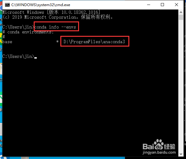 輸入conda info --envs,查看conda 環(huán)境變量的路徑,base后邊就是環(huán)境變量的路徑。