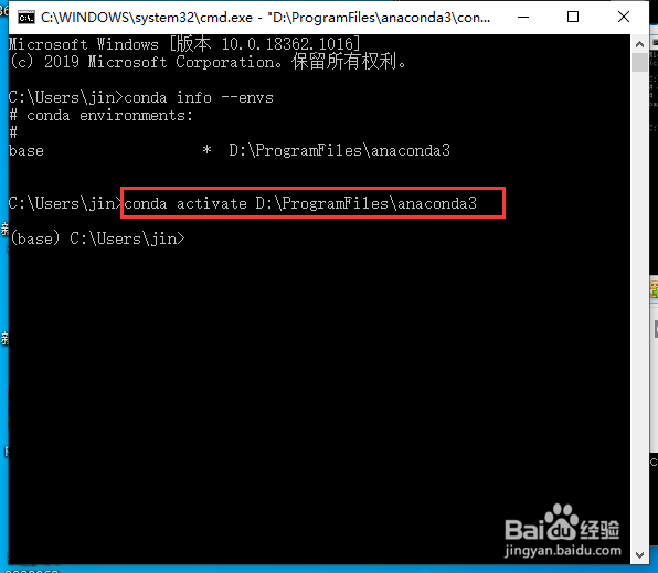第四,接著輸入conda activate +上述查到的環(huán)境變量路徑,激活環(huán)境變量。