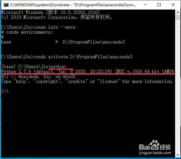第五,激活環(huán)境變量后,再次輸入python,就不會提示W(wǎng)arning了。