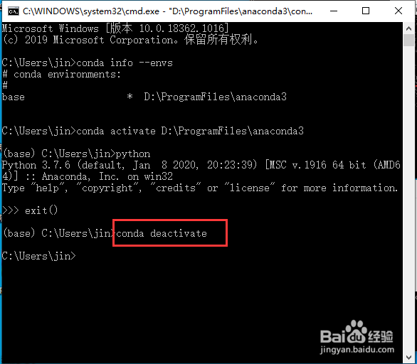 第六,如果想停止激活A(yù)naconda Python的環(huán)境變量,可以使用conda deactivate命令進行停止激活,如下圖。