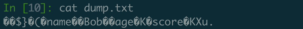In [1]: import pickle In [2]: d = dict(name='Bob', age=20, score=88) In [3]: pickle.dumps(d) Out[3]: b'\x80\x04\x95$\x00\x00\x00\x00\x00\x00\x00}\x94(\x8c\x04name\x94\x8c\x03Bob\x94\x8c\x03age\x94K\x14\x8c\x05score\x94KXu.'