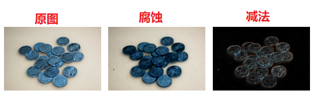 回顧一下,我們前面的開運(yùn)算函數(shù)為cv2.erode(),這里我們首先經(jīng)過開運(yùn)算去除噪聲。然后減法運(yùn)算cv2.subtract()獲取圖像邊界。運(yùn)行之后,效果如下: