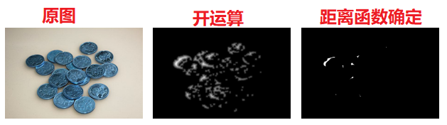 這里,我們使用cv2.morphologyEx函數(shù)進(jìn)行開運(yùn)算,同時使用cv2.distanceTransform得到距離圖像,最后在通過cv2.threshold對距離圖像進(jìn)行閾值處理,確定前景。運(yùn)行之后,效果如下: