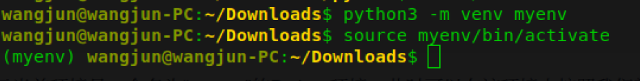 以上命令執(zhí)行完后會發(fā)現(xiàn)命令提示符變了,有個(myenv)前綴,表示當前環(huán)境是一個名為“myenv”的Python環(huán)境,此時可以在該環(huán)境中按照我們熟悉的方式安裝庫、運行程序等