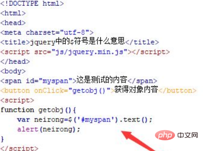 1、新建一個(gè)html文件,命名為test.html,用于講解jquery中的$符號(hào)是什么意思。引入jquery.min.js庫文件,成功加載該文件,才能使用jquery中的方法。使用span創(chuàng)建一行文字,并設(shè)置其id屬性為myspan,主要用于下面通過該id獲得span對(duì)象。