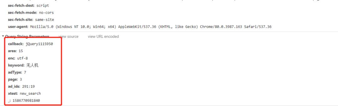 area: 不用管,可以看作一個固定值 enc: 指定編碼, 可以看作固定值"utf-8" keyword: 搜索的關(guān)鍵詞 adType: 不用管,可以看作一個固定值 page: 當(dāng)前的頁碼 ad_ids: 不用管,可以看作一個固定值 xtest: 不用管,可以看作一個固定值 _: 時間戳