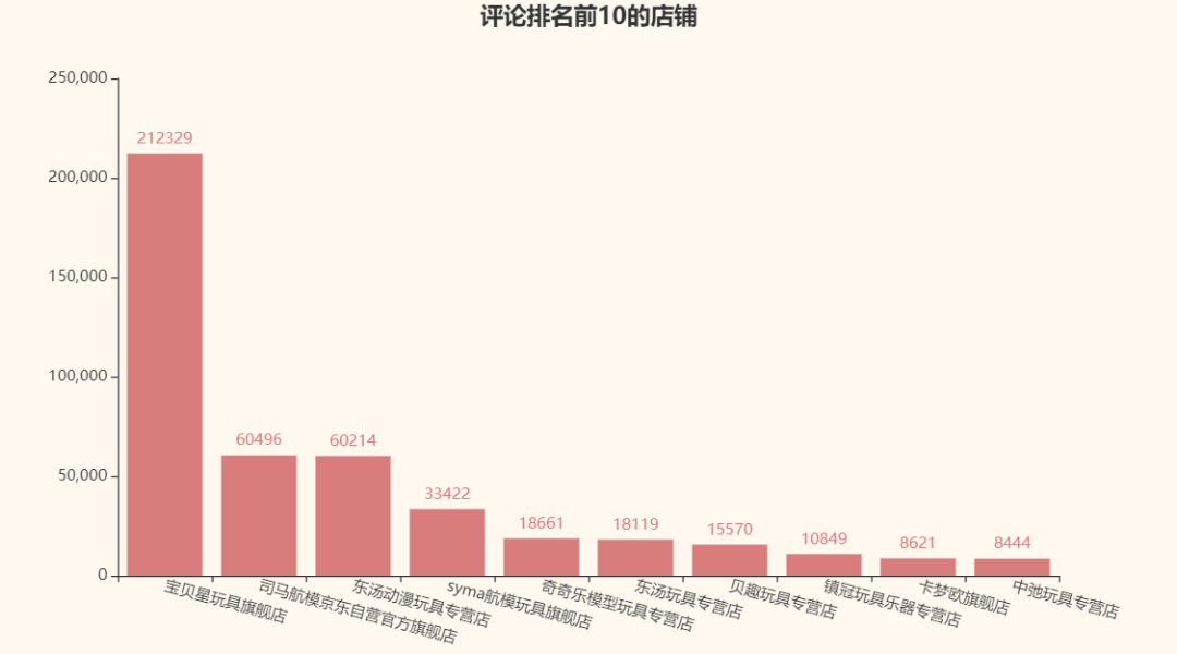 接著,我們再來看看京東自己給的商品排名前10的那幾家店的商品評論數(shù)量唄: