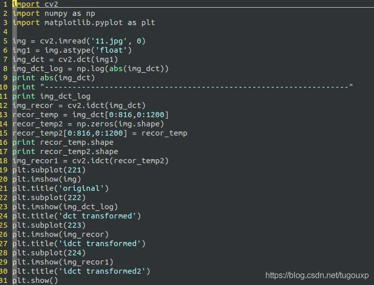 img_dct保存的是dct變換后的矩陣,img_dct_log是矩陣中的元素首先取絕對(duì)值,再求對(duì)數(shù)的矩陣.