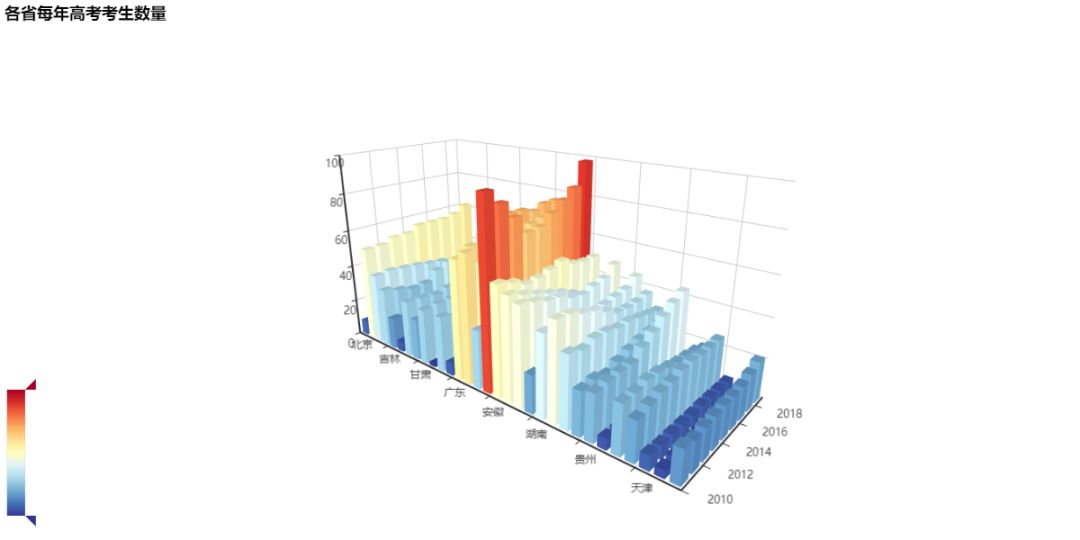 以省份為x軸,年份為y軸,該年該省報(bào)考的考生人數(shù)為z軸來更直觀地看看各省每年的高考考生數(shù)量變化情況吧: