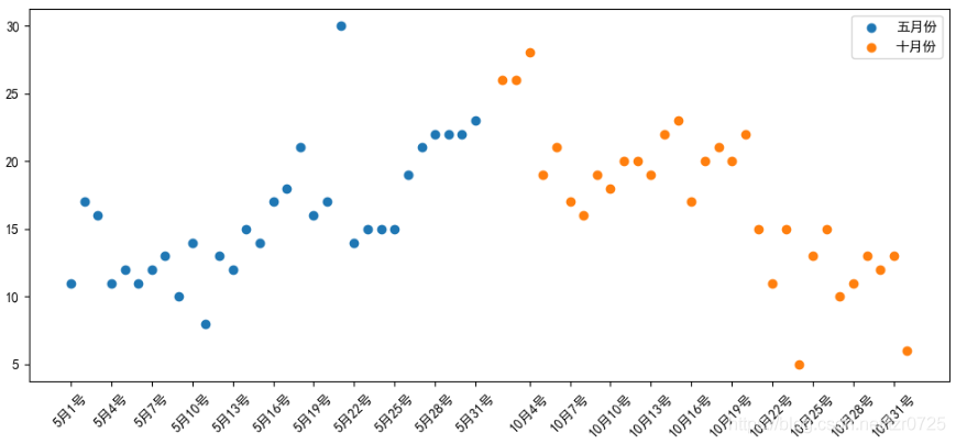上圖雖然繪制出5、10月氣溫隨日期的變化,但兩者混在一起,不便于觀察,現(xiàn)通過修改x數(shù)據(jù),將10月的坐標點集體往坐標軸右側(cè)移動,改進的代碼如下: