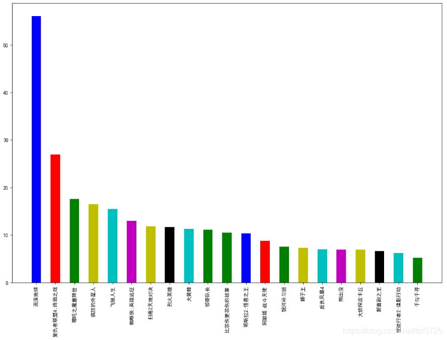 import matplotlib.pyplot as plt # 設置字體 plt.rcParams['font.sans-serif']=['SimHei'] # 替換sans_serif字體 plt.rcParams['axes.unicode_minus']=False # 解決坐標軸負數(shù)的負號顯示問題 plt.figure(figsize=(15,10),dpi=100) # 準備電影的名字以及電影的票房數(shù)據(jù) movie_name = ["流浪地球","復仇者聯(lián)盟4:終局之戰(zhàn)","哪吒之魔童降世","瘋狂的外星人", "飛馳人生","蜘蛛俠:英雄遠征","掃毒2天地對決","烈火英雄","大黃蜂", "驚奇隊長","比悲傷更悲傷的故事","哥斯拉2:怪獸之王","阿麗塔:戰(zhàn)斗天使", "銀河補習班","獅子王","反貪風暴4","熊出沒","大偵探皮卡丘","新喜劇之王", "使徒行者2:諜影行動","千與千尋"] y = [56.01,26.94,17.53,16.49,15.45,12.96,11.8,11.61, 11.28,11.12,10.49,10.3,8.75,7.55,7.32,6.99,6.88,6.86,6.58,6.23,5.22] # 放進橫坐標的數(shù)字列表 x = range(len(movie_name)) # 畫出條形圖 # 顏色color參數(shù)表示條形圖的順序顏色,可循環(huán) plt.bar(x, y, width=0.5, color=['b','r','g','y','c','m','y','k','c','g','g']) # 修改刻度名稱,并旋轉(zhuǎn)90度 plt.xticks(x, movie_name, rotation=90) # 展示圖形 plt.show()
